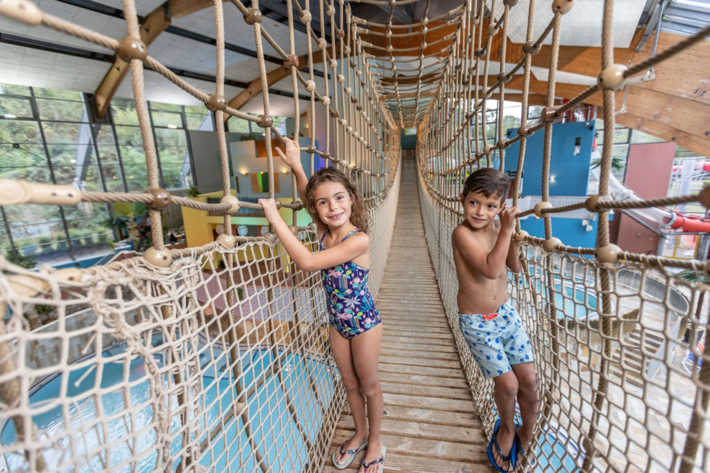 Das Schnorchelriff mit eigener Unterwasserwelt im Sportbecken, in die bis auf 3,60 m hinuntergetaucht werden kann, bleibt erhalten. Eine echte Mutprobe für Abenteurer ist es, unsere kürzlich vollständig neu hergestellte Seilhängebrücke unter dem Hallendach zu überwinden. Über dem Erlebnisbecken verbindet sie mit einer Länge von 44 m auf 16 m Höhe die Gastronomie-Ebene mit der Rutschen-Ebene.